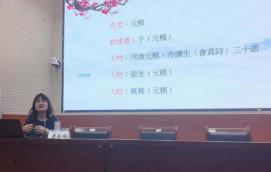 康韵梅以《莺莺传》为例凸显唐人小说独特的魅力,认为文本的书写形成镜像反映,作者元稹以其尝试鑑照的叙事风格勾勒主人公情爱关系中的自我主体形象。同时,康教授对唐代社会生活、婚姻礼教等问题进行了深入解读,其创新性阐述,引起在座师生的强烈共鸣。