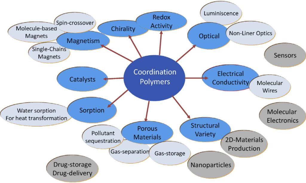 金属有机框架化合物(MOFs),又称配位聚合物(Coordination Polymers),这类材料由于其固有的多级孔道、较大比表面积和特殊的拓扑结构,使得它们在气体的分离与存储、气液分离、药物传递、离子交换、传感技术、多相催化和能量转化等方面展现了诸多优势(图3),从而广泛应用于发光、非线性光学、磁性和光电功能材料等领域。