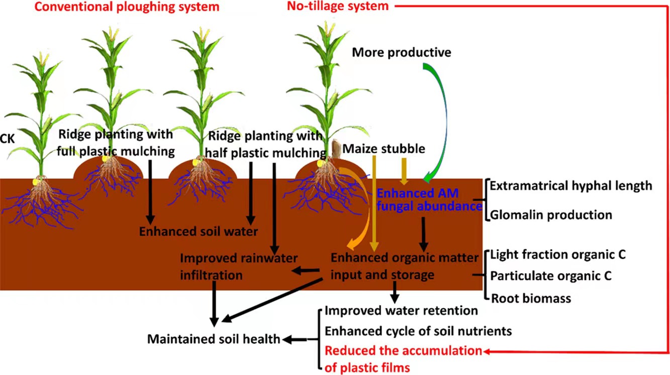团队研究发现,常规聚乙烯地膜和生物降解地膜残留对作物生产效益影响相似。在实际的农业生产中,全生物降解膜从膜形态到完全降解需要一个过程(J. Hazard. Mater. 416, 2021, 125954.),在此过程中它们以残膜碎片的形式存于土壤,同样会为作物生产力和土壤生态带来负面影响(J. Hazard. Mater. 414, 2021, 125521.)。对于地膜污染控制方面,团队发现在黄土高原雨养农业区采用隔沟覆膜和免耕相结合的方法,增加雨水入渗的同时从时间和空间尺度实现地膜减量1/3至1/2。该研究揭示了地膜减量不减产的关键影响因素和根土系统调控机理(Resour. Conserv. Recy. 190, 2023, 106851.),此外,秸秆立体覆盖和活三叶草立体覆盖可以获得与聚乙烯地膜覆盖相似的水分生产力,至关重要的是,有机立体覆盖展现出修复土壤MPs和PAEs污染的巨大潜力,可作为干旱灌区替代聚乙烯地膜覆盖的绿色解决方案(J. Hazard. Mater. 435, 2022, 128981.)。