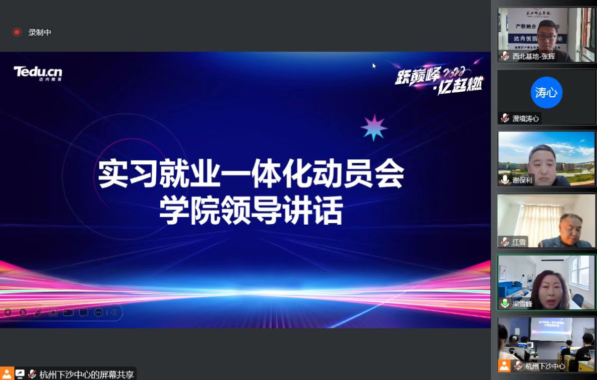 2019级大数据专业全体学生、达内集团教学实训团队教师在杭州下沙教学实训中心线下参会。学院领导班子成员、辅导员、班主任,达内集团驻天水师范学院团队教师在线参加会议。