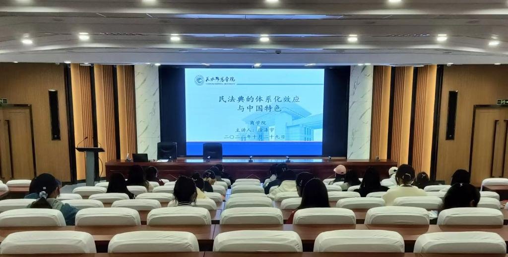 10月29日上午,由科研处主办,商学院、天水市劳动人事争议仲裁院、秦州区人民检察院共同承办的伏羲大讲坛第85讲、商学院“经世论坛”2022年第5讲(总第11讲)学术报告会在学校一号报告厅举行。报告以线上线下相结合的方式开展,共设师生代表会议室、天水市劳动人事争议仲裁院会议室、秦州区人民检察院会议室、腾讯会议室4个会场。哲学社会科学领军人才、中南财经政法大学徐涤宇教授应邀为商学院师生、市劳动人事争议仲裁院、区人民检察院干部职工共300余人作题为《民法典的体系化效应与中国特色》线上主题报告。