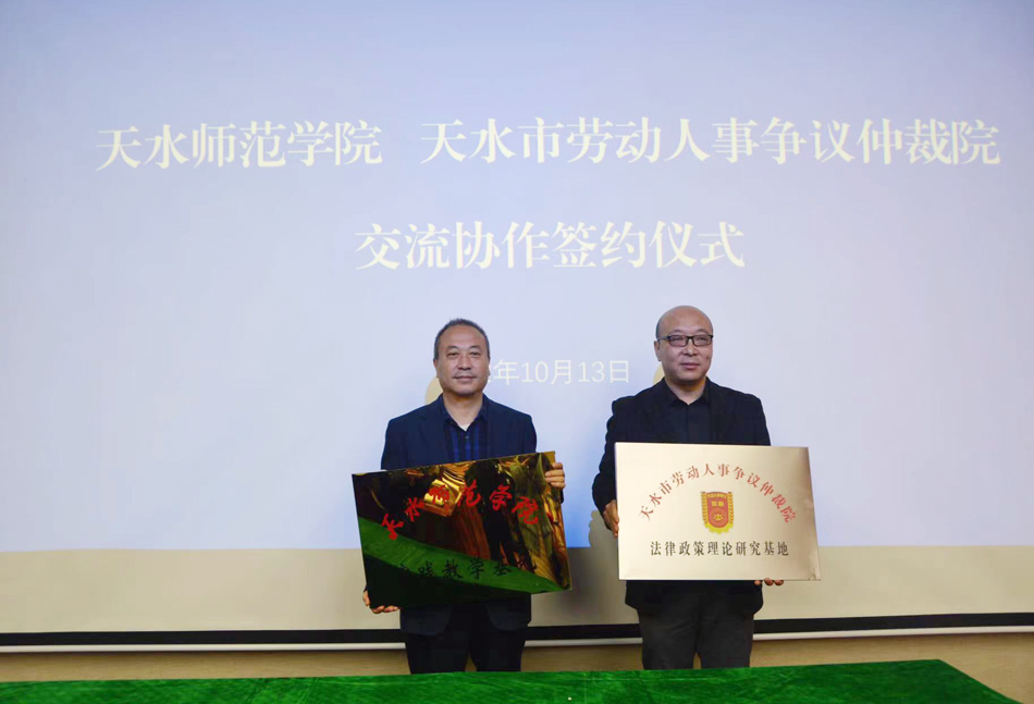 刘睿和王雪琳代表双方签订合作框架协议。李海成和王雪琳分别为对方授予天水市劳动人事争议仲裁院理论与实践研究基地、天水师范学院实践教学基地铭牌。