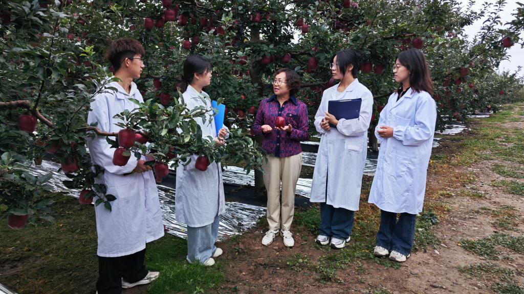 中心首席专家呼丽萍研究员(中)在天水市麦积区南山万亩花牛苹果基地指导学生开展调查研究