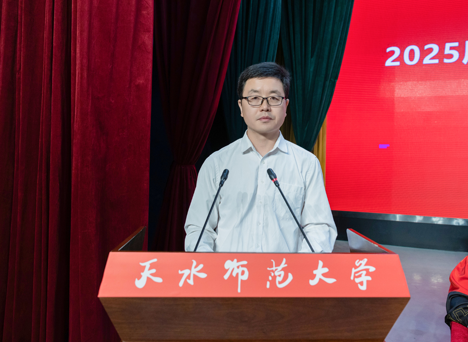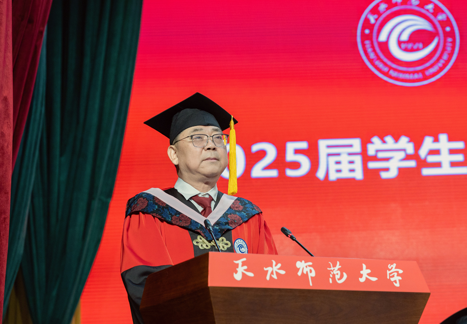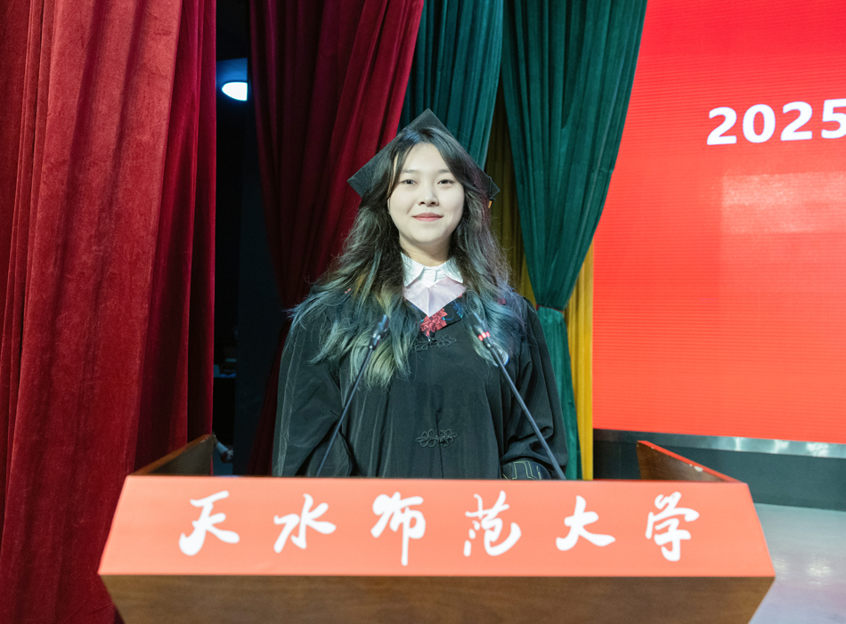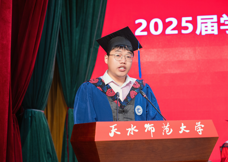 硕士生代表、文学与文化传播学院苏利伟回顾了与母校共同成长的三年求学时光,感恩导师指导和母校培养,并分享了从学术探索到考取陕西师范大学博士研究生的心路历程。