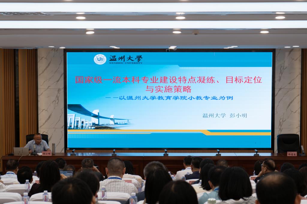 温州大学彭小明教授作《国家级一流本科专业建设特点凝练、目标定位与实施策略——以温州大学教育学院小教专业为例》的主旨报告。他围绕温州大学“博爱雅艺”核心师范文化,通过课程思政和专业思政路径的完善,全流程人才培养体系优化,以及“359”实践教学模式和“五位一体”实践体系的建立,全面介绍了一流小学教育专业的建设经验。同时还分享了天津师范大学“五优联动、三链协同”卓越教师培养模式、beat365平台官方网站“乡村小学全科教师‘五三’模式”,以及温州大学“溯初实验班”精英教师遴选培养等鲜活案例,为国家级一流本科专业建设提供了有益借鉴。